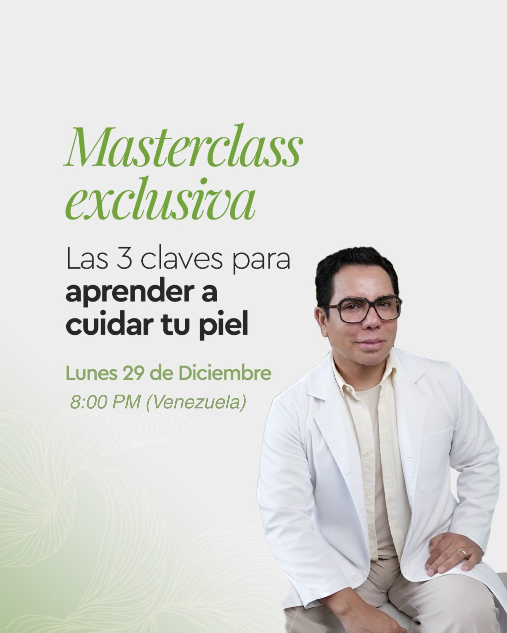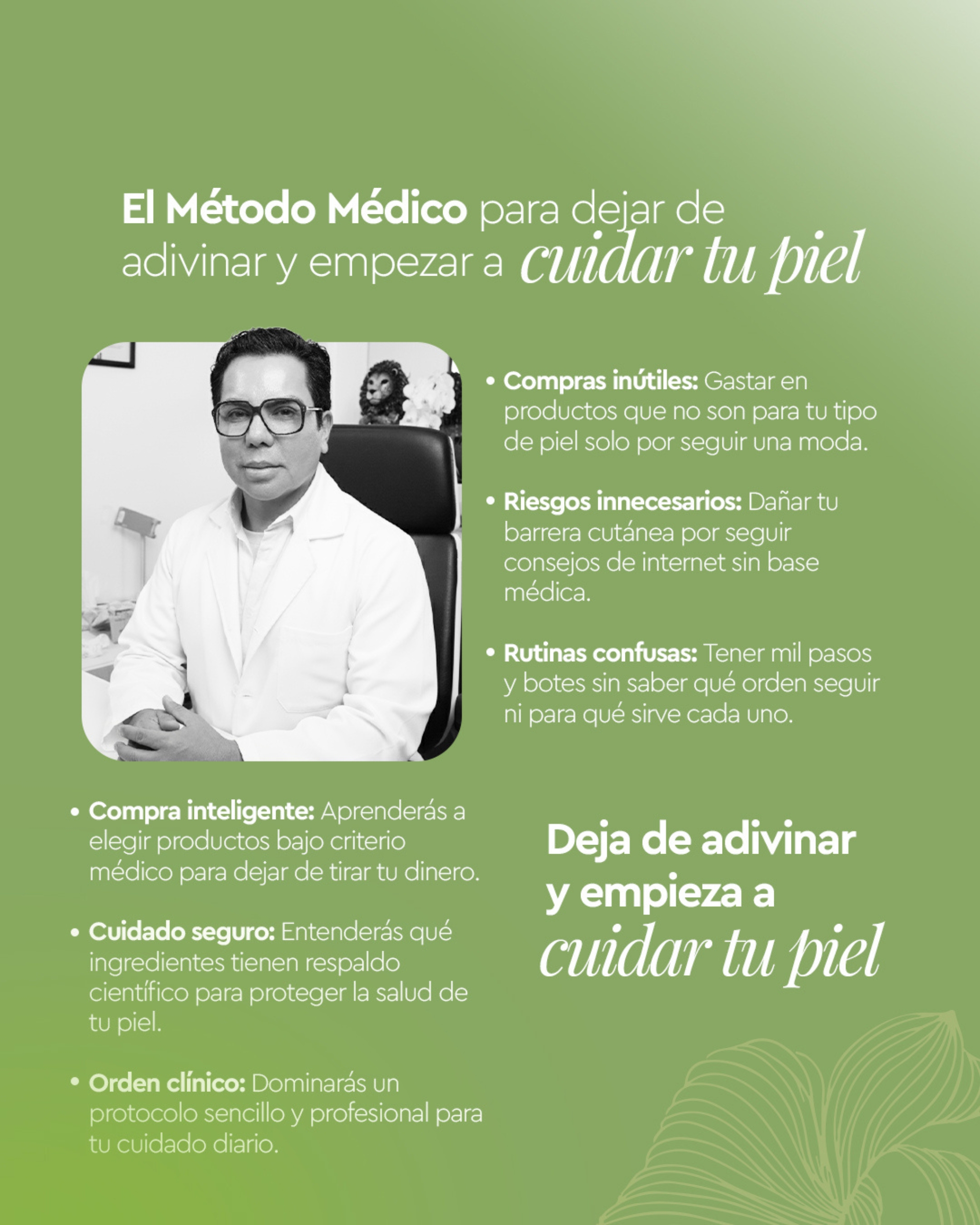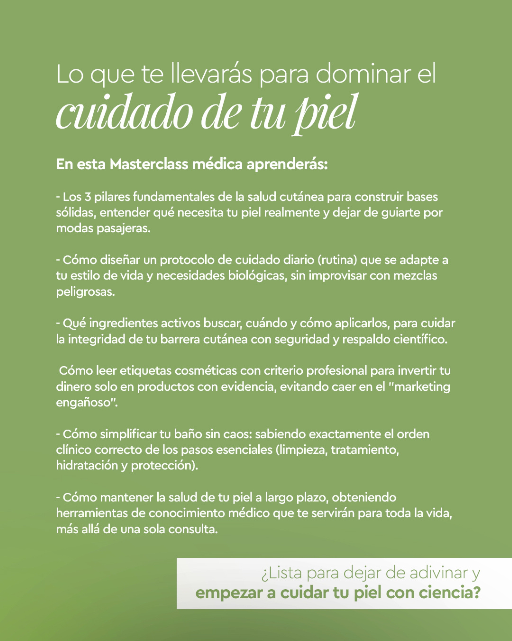 Ten en cuenta que esta mentoría es únicamente educativa, basada en la experiencia del doctor con otros pacientes. No tiene un uso clínico ni permite autodiagnosticar a nadie. Es solo para que aprendas y entiendas tu piel mejor.