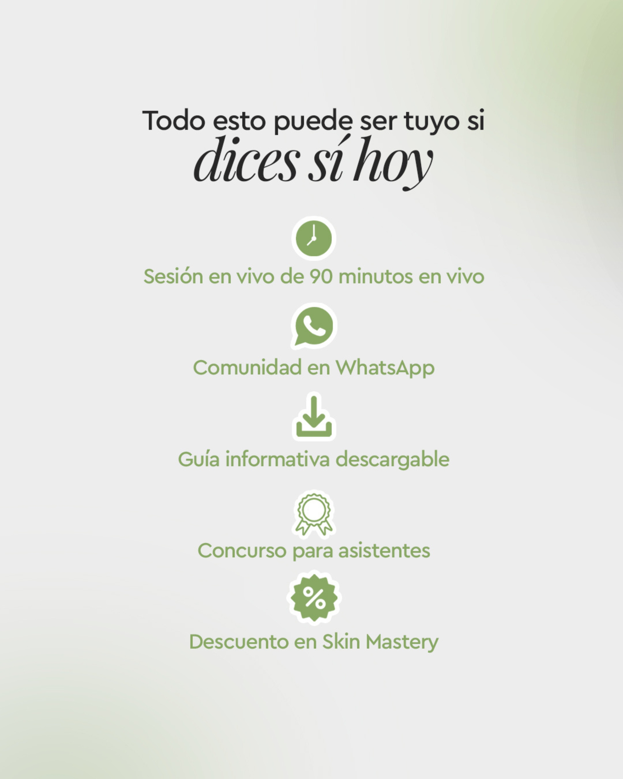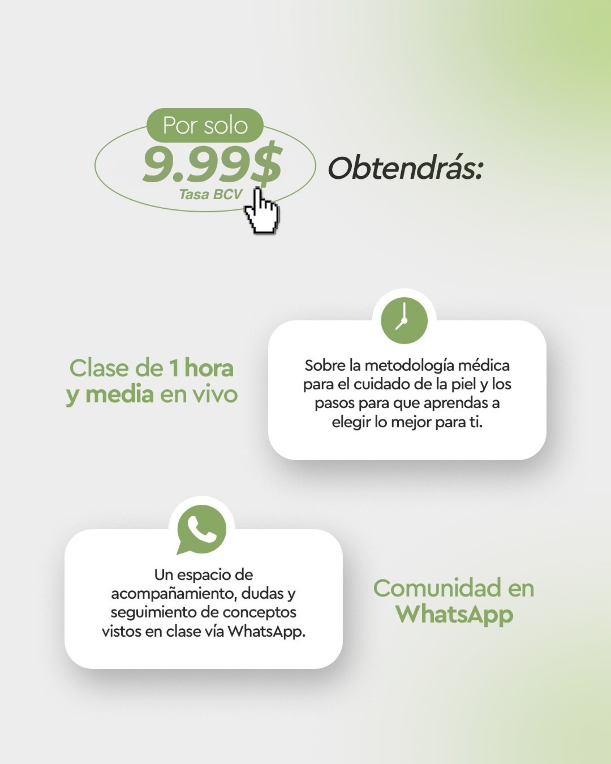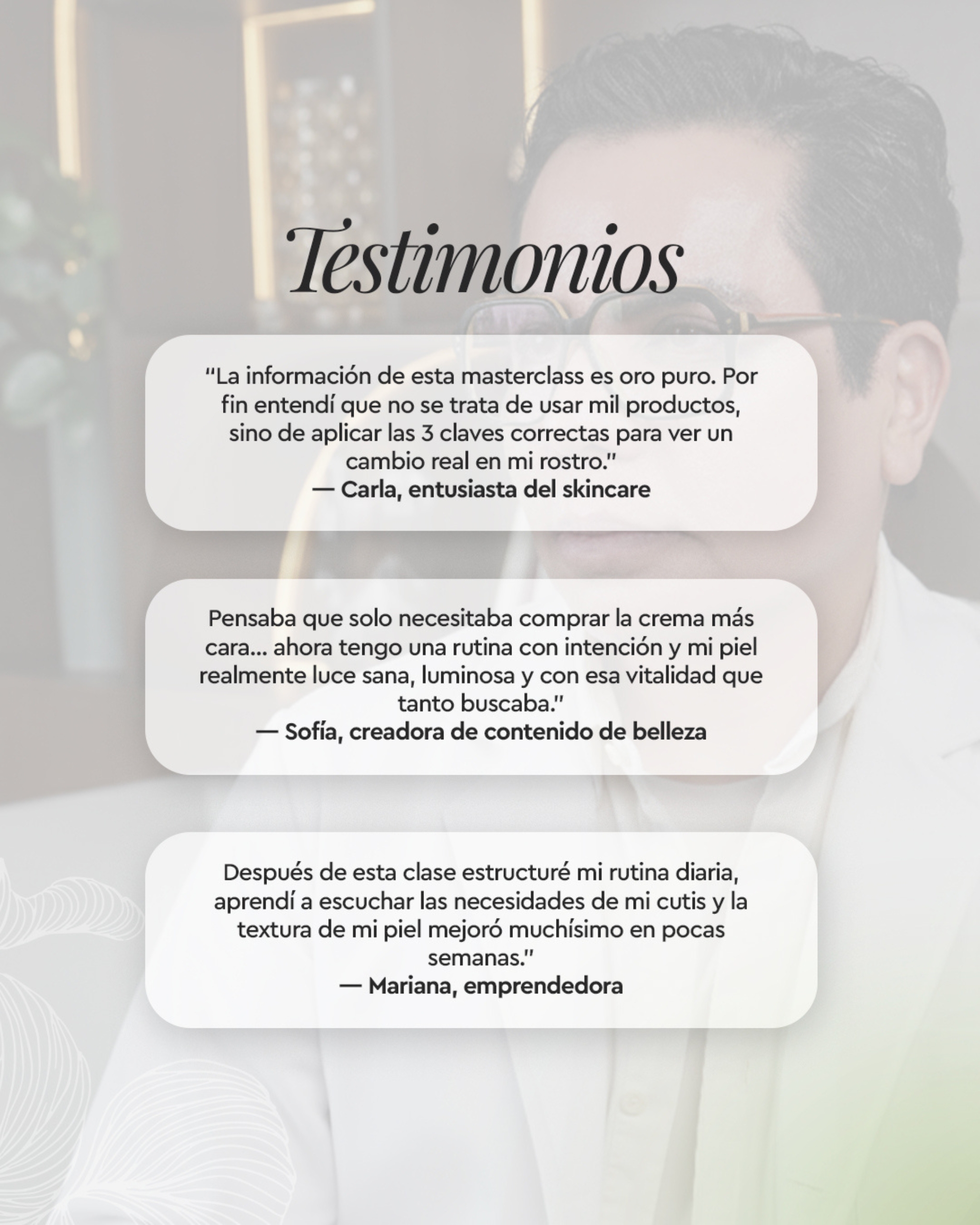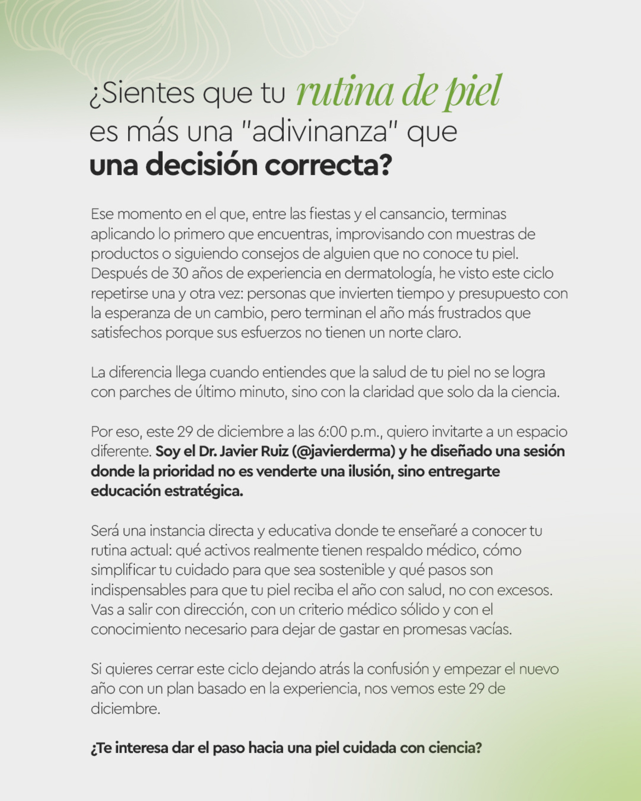 Ten en cuenta que esta mentoría es únicamente educativa, basada en la experiencia del doctor con otros pacientes. No tiene un uso clínico ni permite autodiagnosticar a nadie. Es solo para que aprendas y entiendas tu piel mejor.